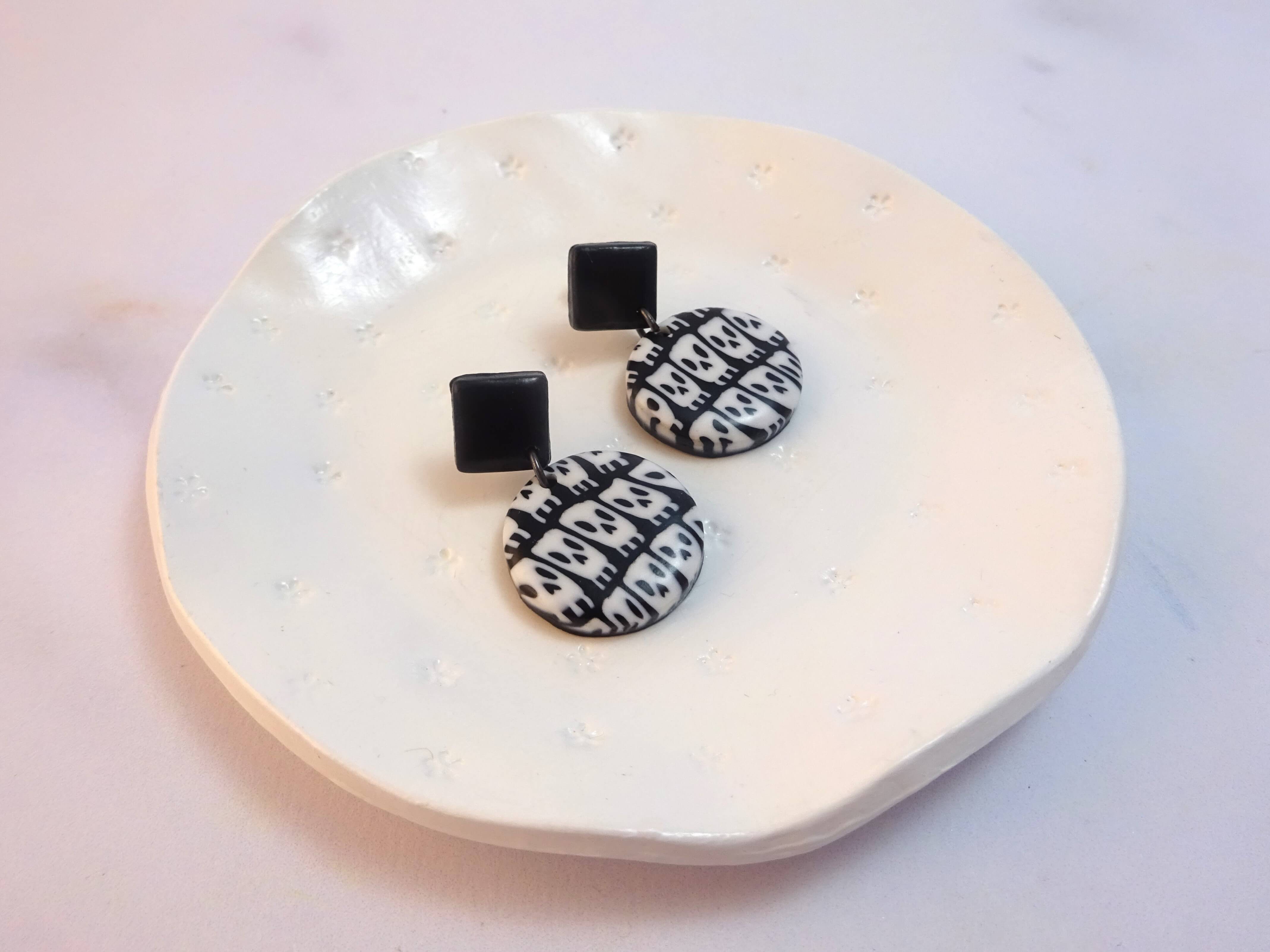 Black and white statement earrings with a skull pattern with black square stud tops.