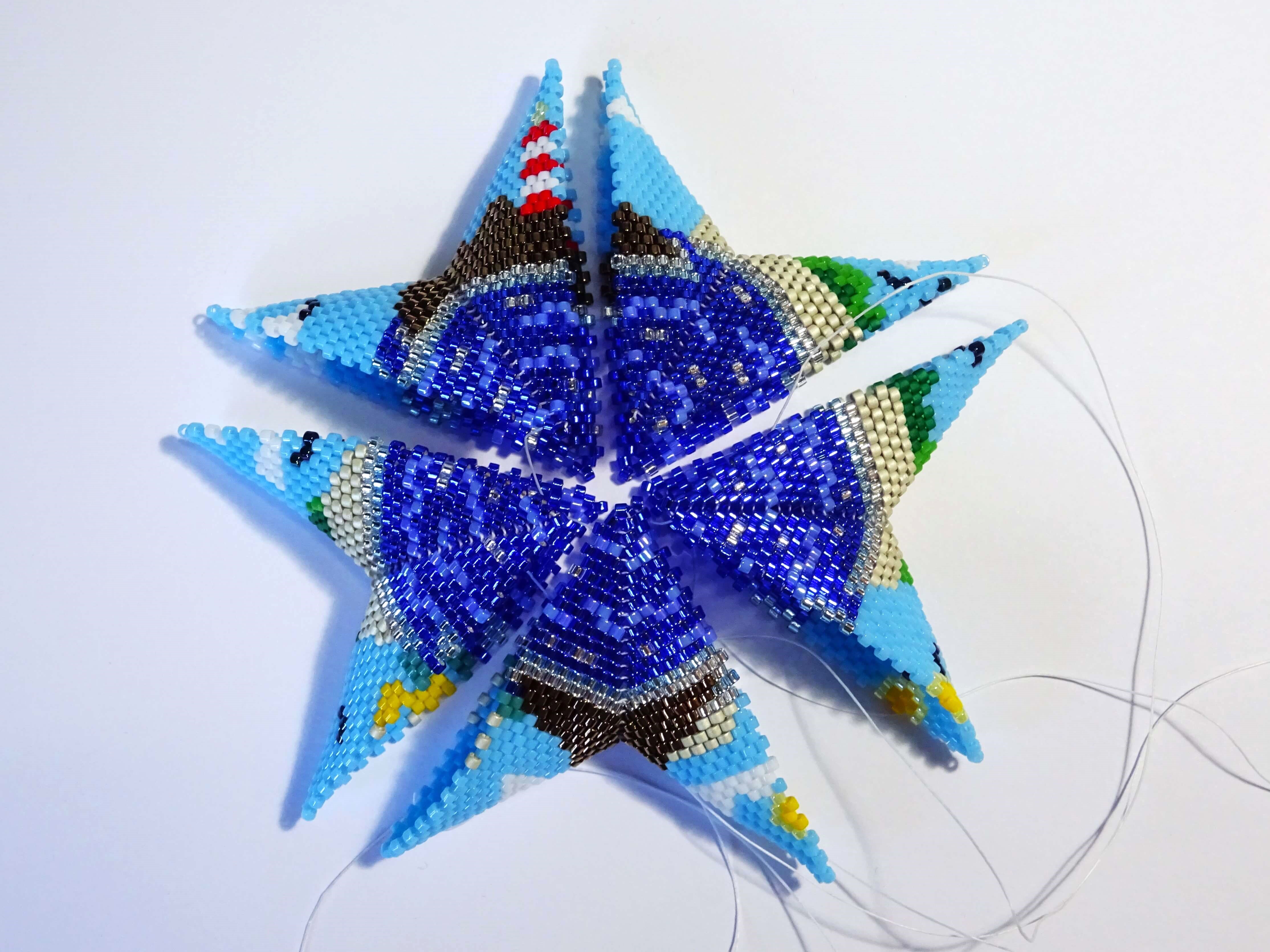 The coastal theme of this bead pattern is inspired by the natural beauty of the ocean and shoreline. At the top of the pattern is a distinctive light house on a rocky cliff. The cliffs are echoed around the whole star with greenery to add more depth and dimension to the beading. The pattern features shades of blue and silver to mimic the colours of the sea and to add movement to the water. Intricate details such as birds, clouds, a sun and even a boat are added to evoke bright sunny days. These elements come together to create a stunning and dynamic pattern that captures the essence of the coast.