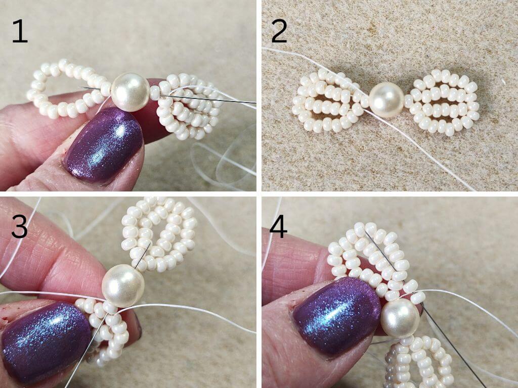 - Take the needle through the seed bead at the end of the pearl, the pearl and the seed bead on the other side of the pearl.