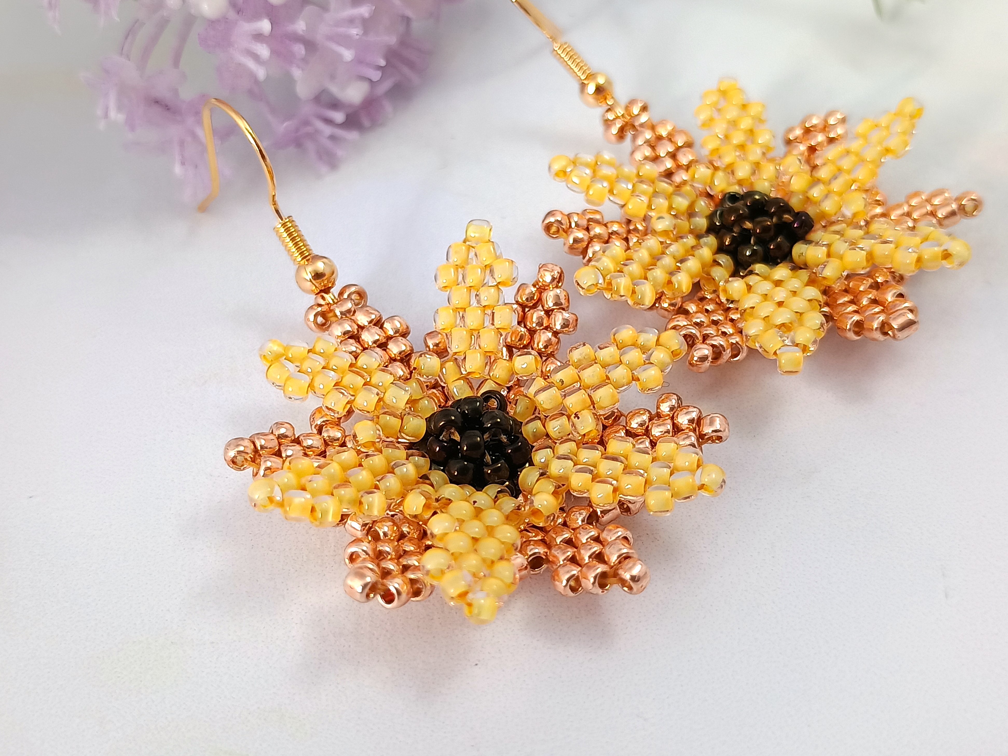 Obviously, nature provides us with a variety of flower colours so there is no need to feel restricted to yellow and rose gold for your petal colours. For a more fiery, these flowers would look amazing in hot pink, red and orange. For a softer look, they would look lovely made from pastel peach and light pink seed beads.