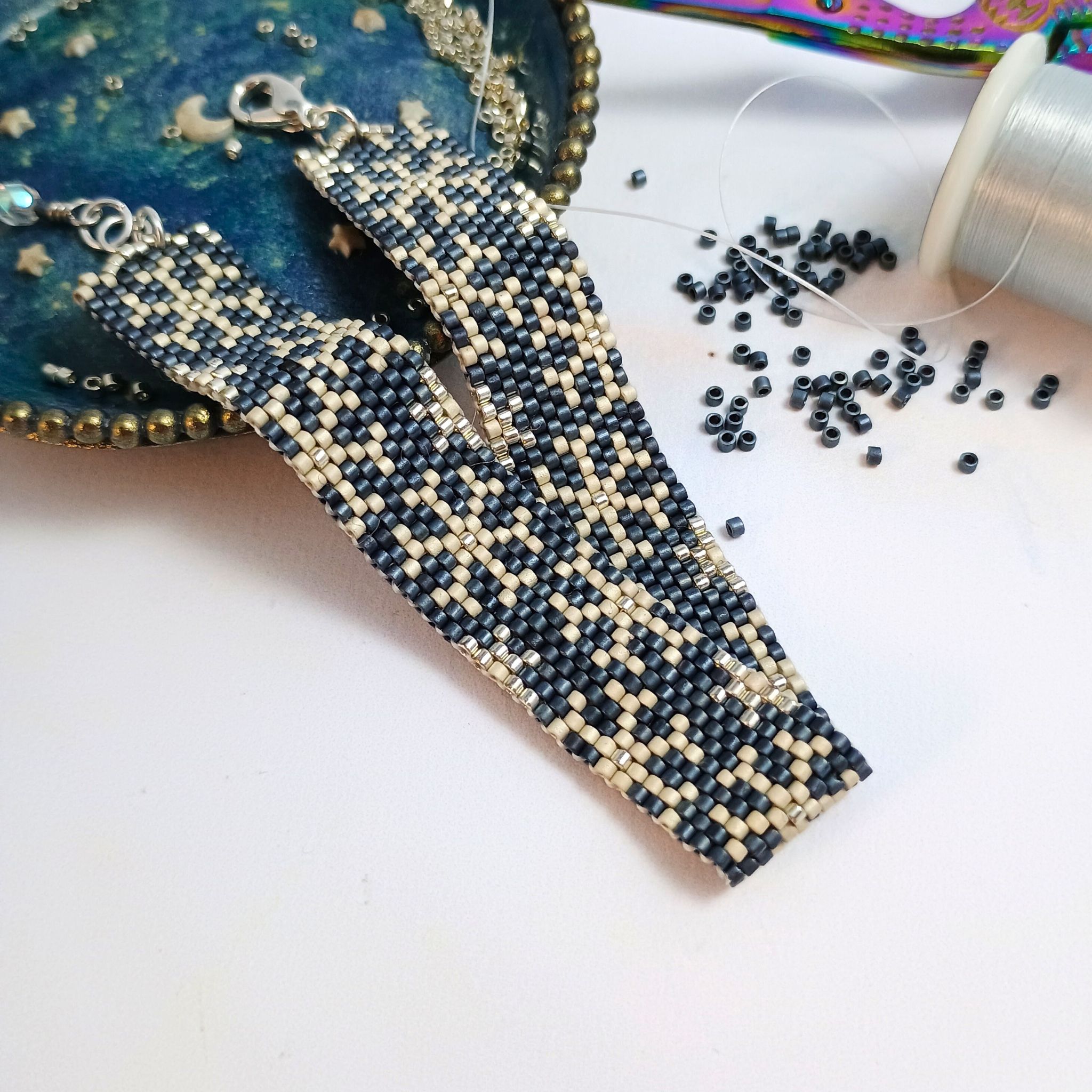 I have used very muted tones for this bracelet. My two previous patterns on Etsy, the reindeer with holly peyote triangle and Nutcracker, used vibrant colours of beads so I enjoyed designing this one with a much softer colour palette. The soft matte silver beads sit alongside shiny silver Delica forming a lovely two tone effect in the snowflakes. In order to allow the snowflakes to stand out, I have set them against this gorgeous dark blue/grey bead. The overall effect is both delicate and sophisticated (in my opinion!)