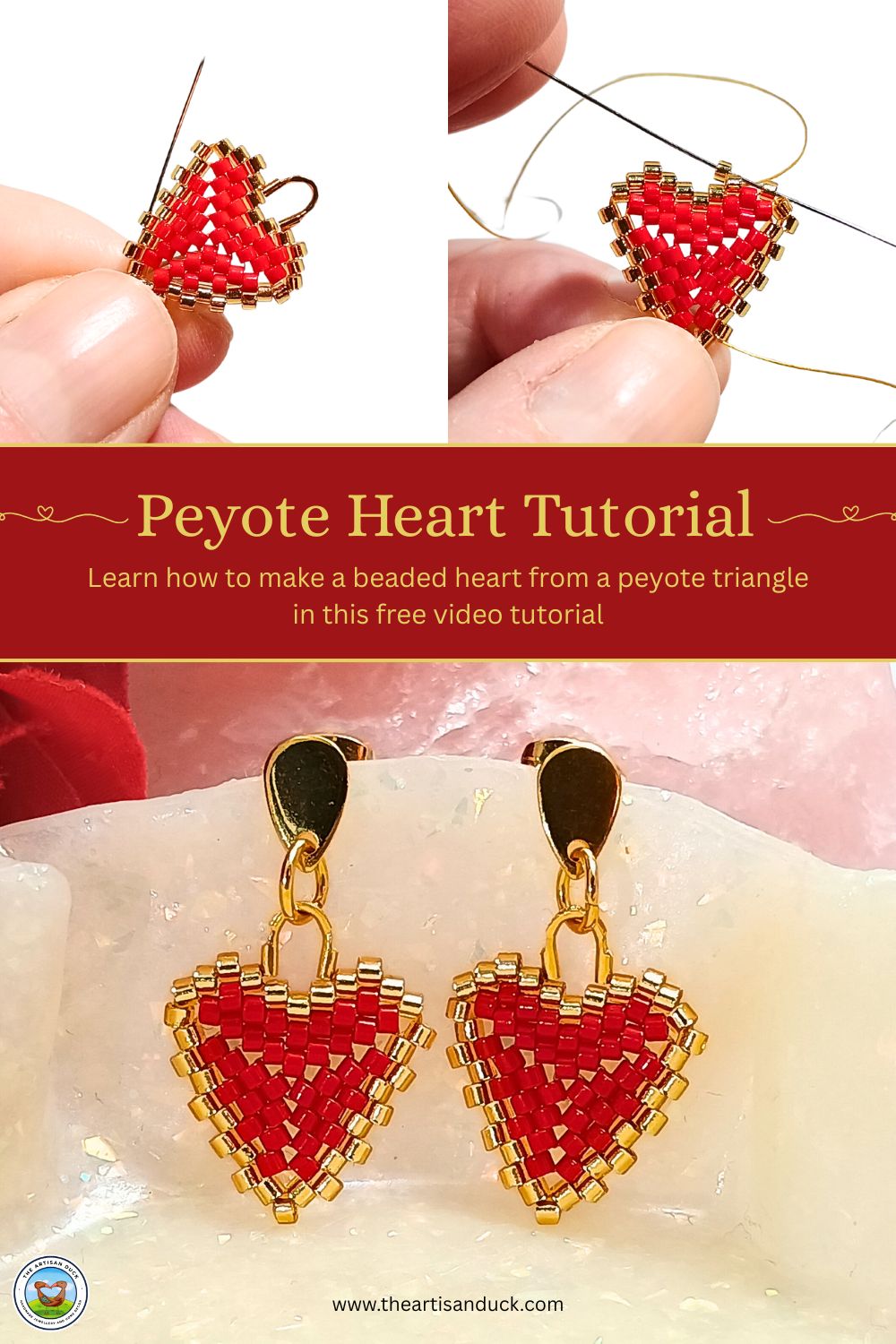 In the video tutorial below, I show every step and every bead, from the basics of making a peyote triangle to shaping the top to form the heart shape and adding the wire guardian so the heart can be used for earrings or as a necklace pendant.