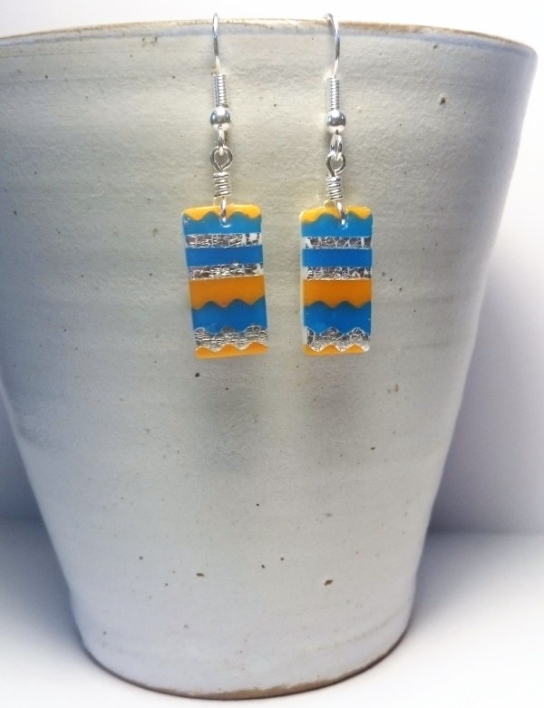 The rain has stopped briefly so I thought I would try to entice the sun out by showing you the new Fimo jewellery I have made. I have used a base of white clay and put strips of translucent orange and blue alongside silver foil on white clay. I used my serrated blade to get the... Continue Reading →
