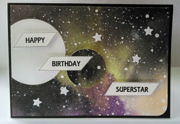 A recent make for my Nephew. Crafty stash used: Tim Holtz Distress Ink Pads - Squeezed Lemonade, Dried Marigold, Dusty Concord and Black Soot White acrylic paint watered down Stars from Lawn Fawn Stitched Journaling die set Spellbinder Nestabilities Circle die set Ultra fine crystal glitter Silver paint pen To begin I pressed the ink pads... Continue Reading →